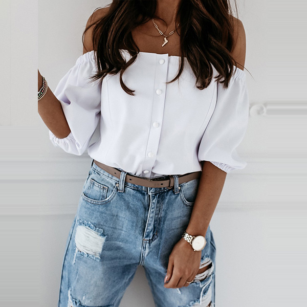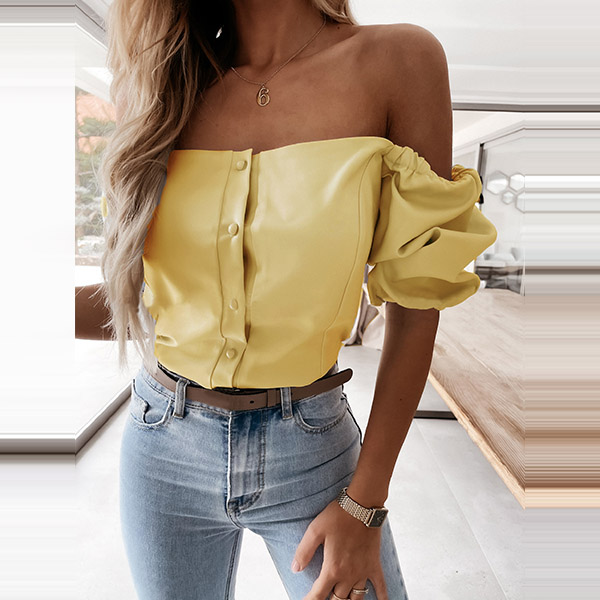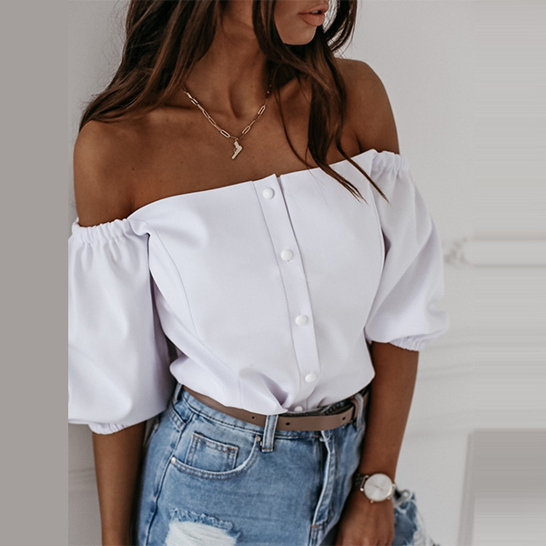 Sexy Off-shoulder Boat Neck Puff Sleeve Solid Color Top