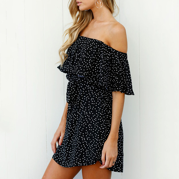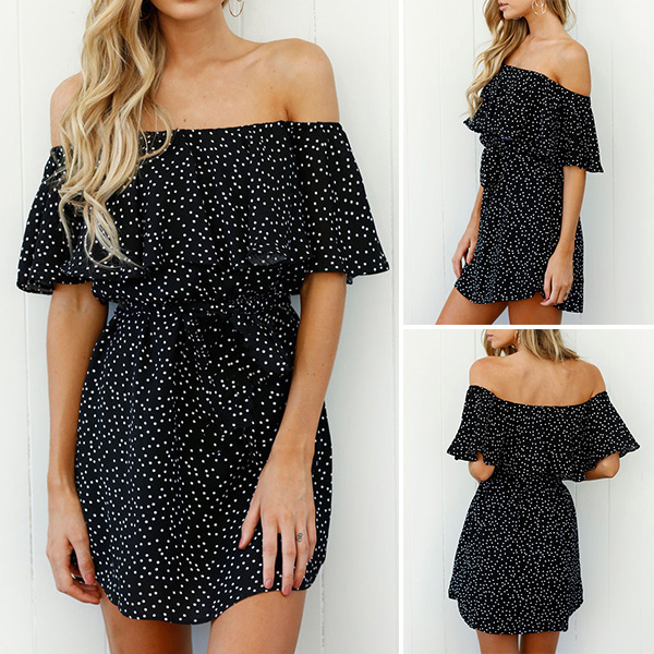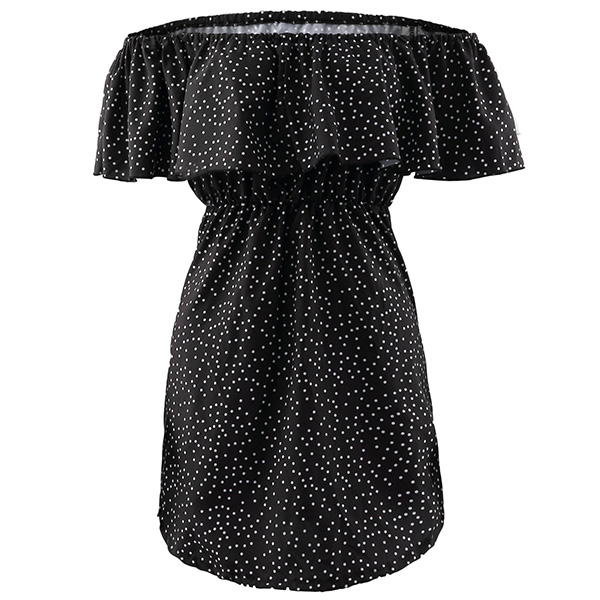 Enhance your feminine appeal through this dress. Its off-shoulder wide neckline with ruffle design makes this dress more