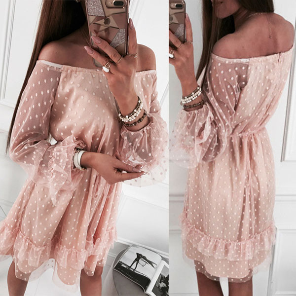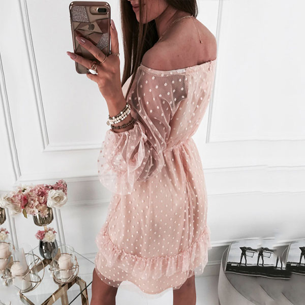 Sexy Off-shoulder Boat Neck Ruffle Hem Dots Gauze Dress