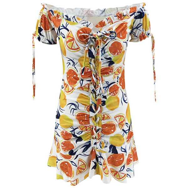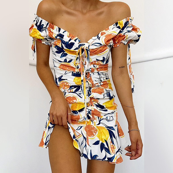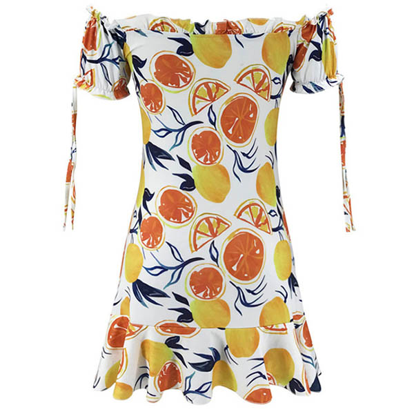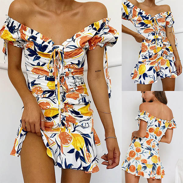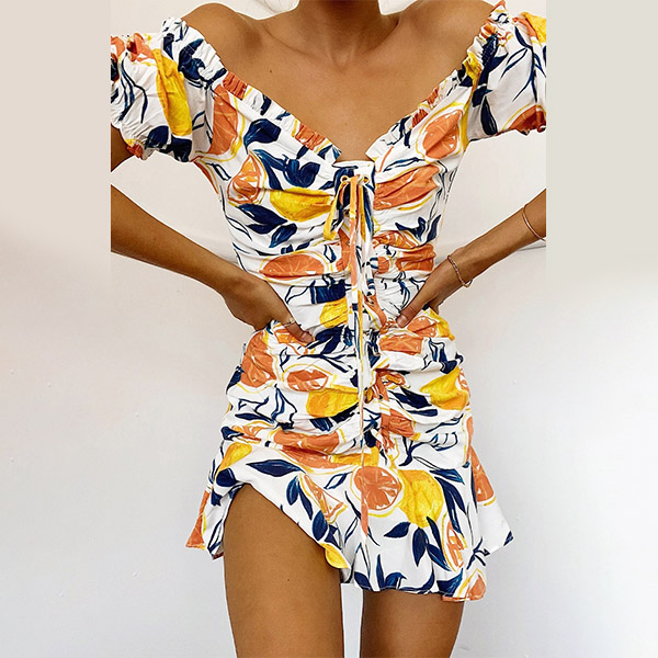 You are sure to be a pleasant sight to draw more attention when you dress yourself up with this beautiful dress. The colorful printed details make this piece look so eye-catching,while the off-shoulder boat neck,ruffle hem and drawstring design can easily enhance your feminine appeal. For some fancy events,you can trust in this piece to win more eyes.