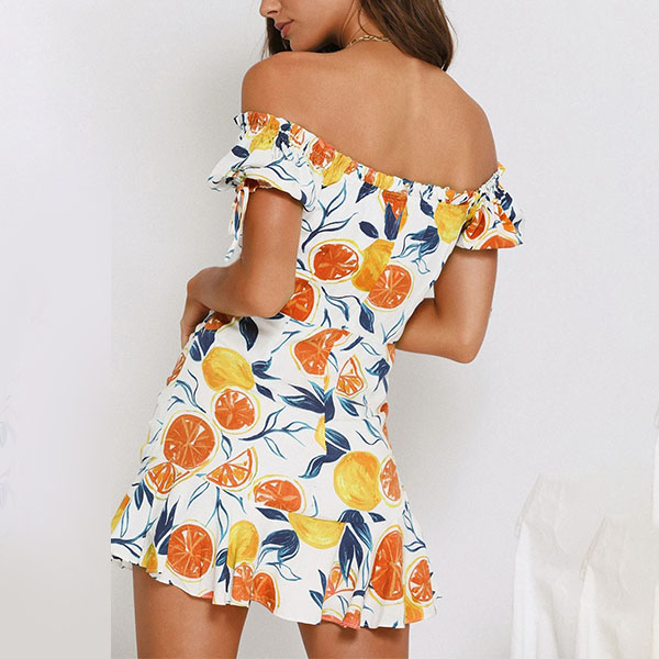 Sexy Off-shoulder Boat Neck Ruffle Hem Printed Dress