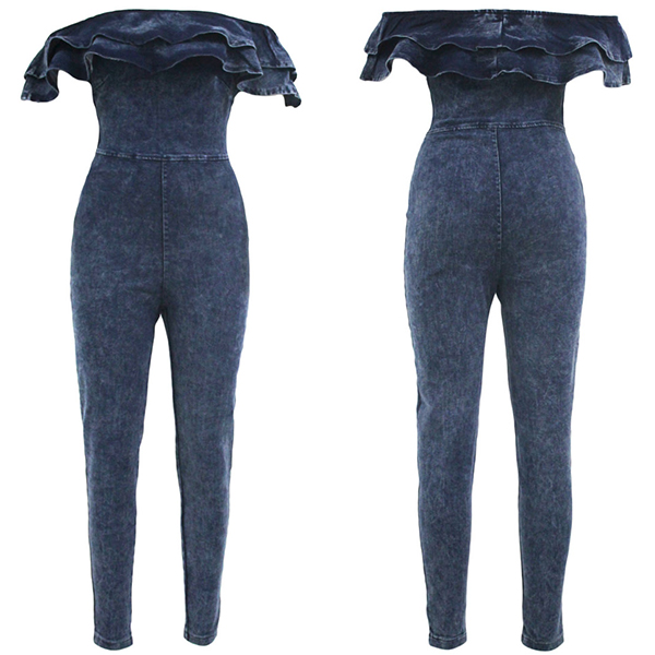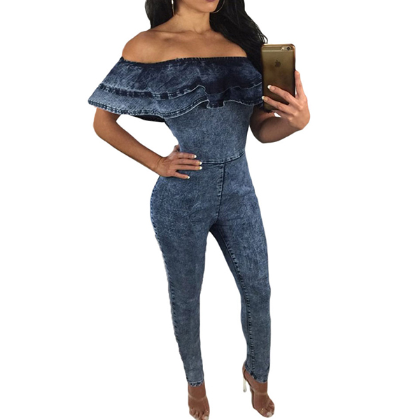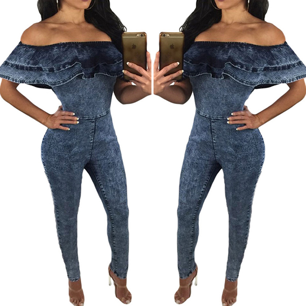 Wanna demonstrate your seductive curve and sultry style? This denim jumpsuit is a good choice. Its off-shoulder