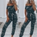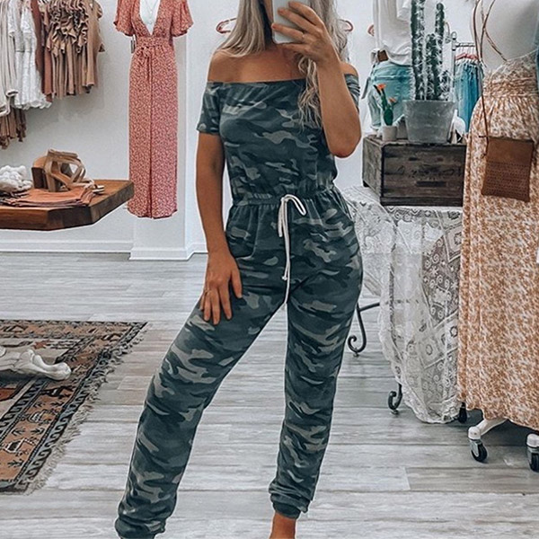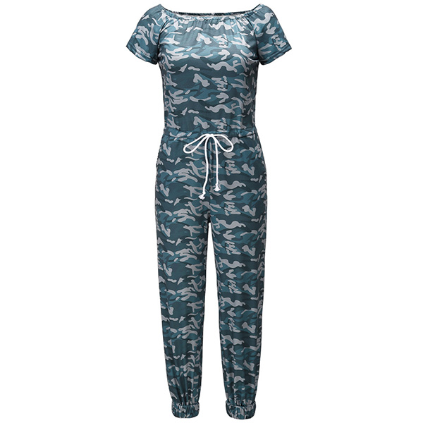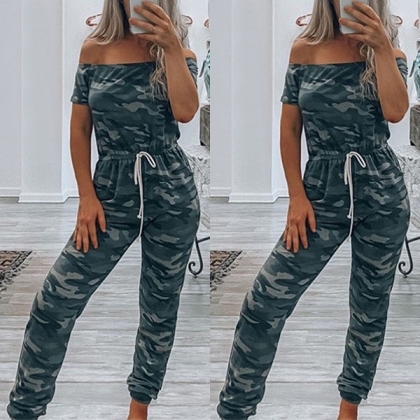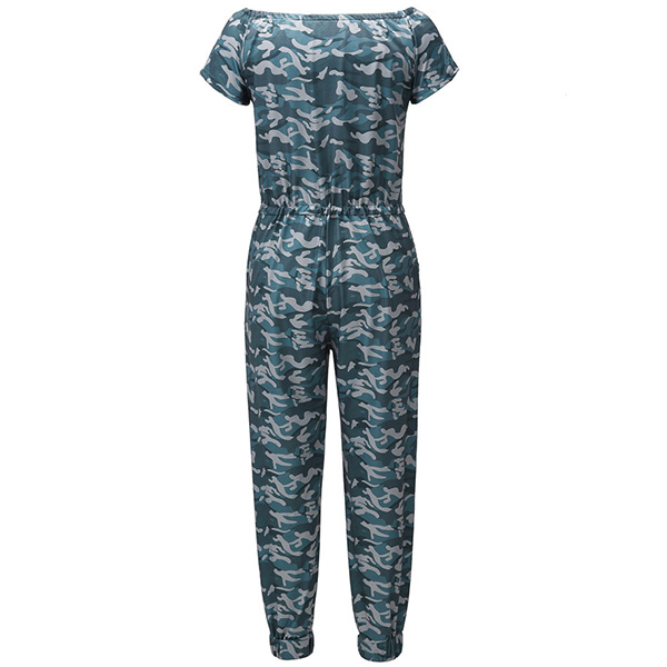 Sexy Off-shoulder Boat Neck Short Sleeve High Waist Camouflage Printed Jumpsuit
