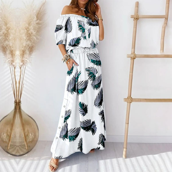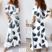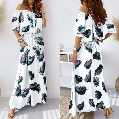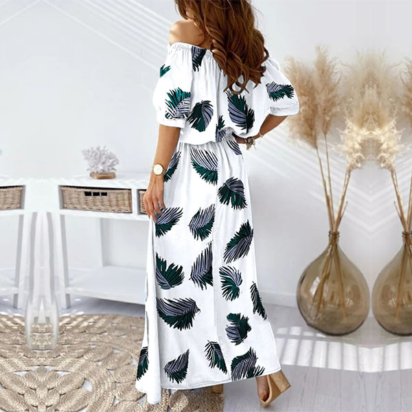 Sexy Off-shoulder Boat Neck Short Sleeve High Waist Printed Maxi Dress