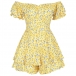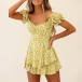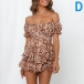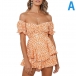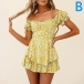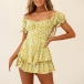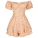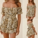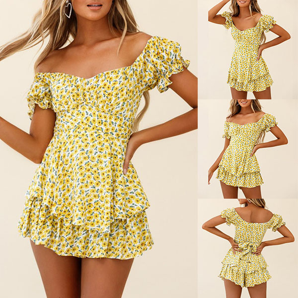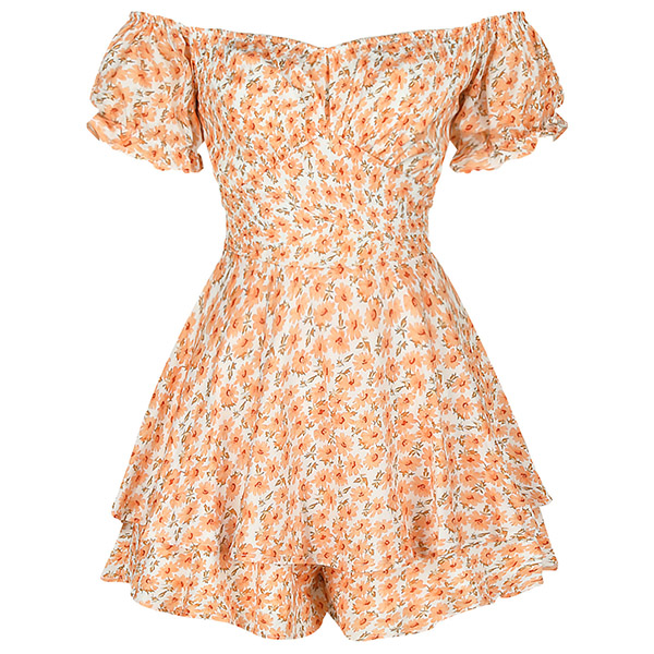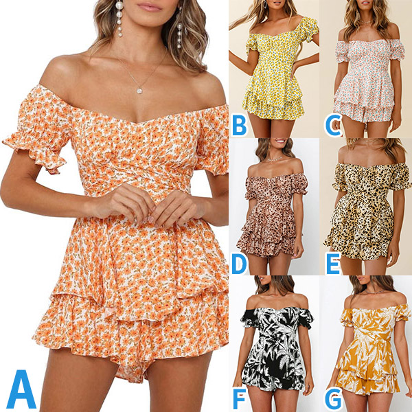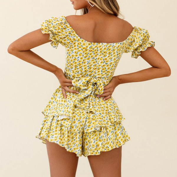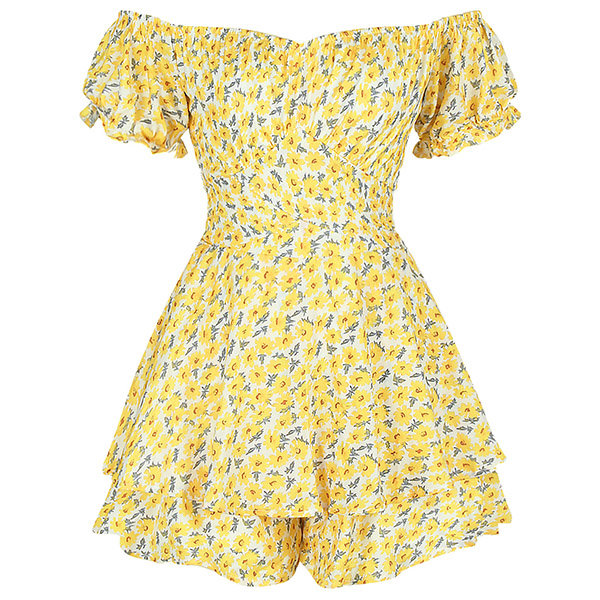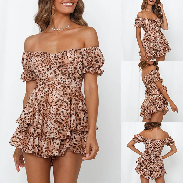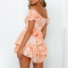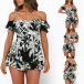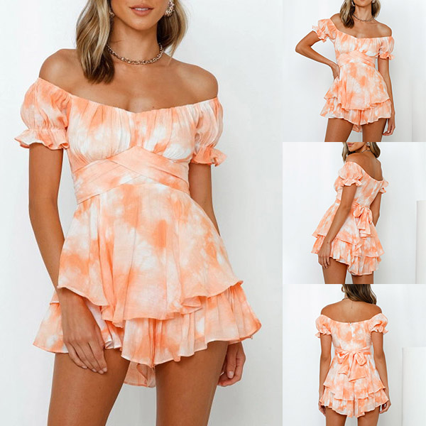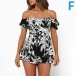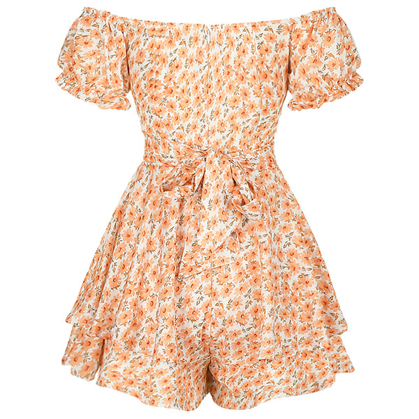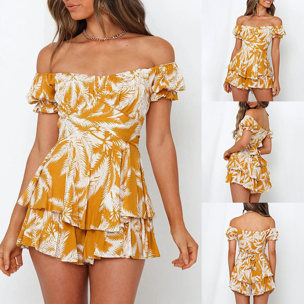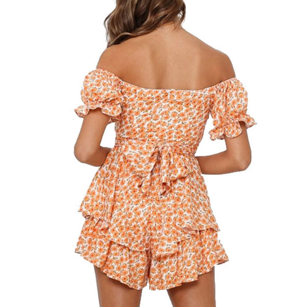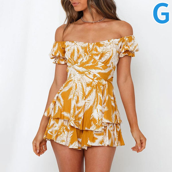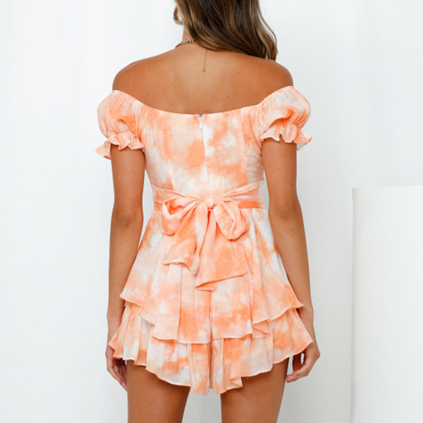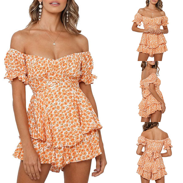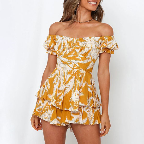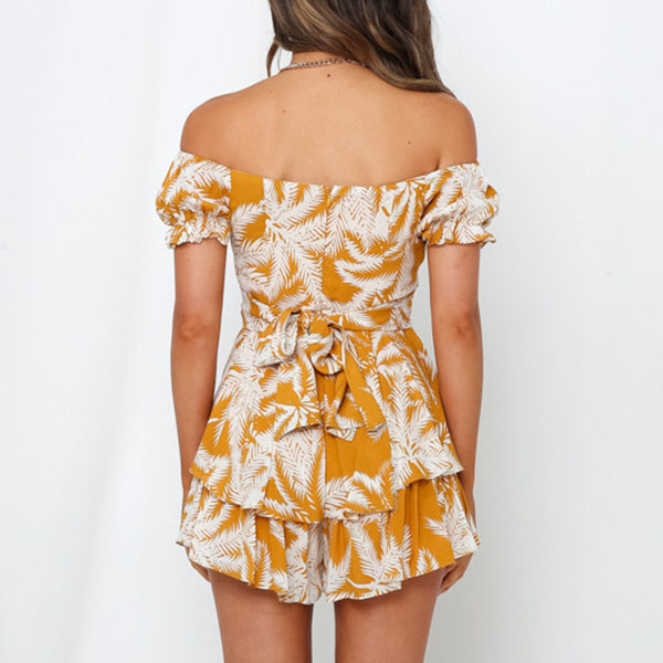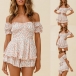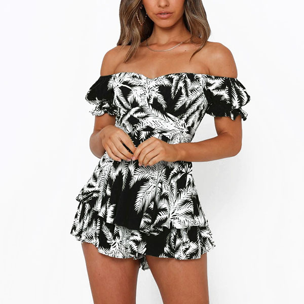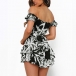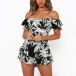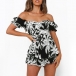 Sexy Off-shoulder Boat Neck Short Sleeve High Waist Ruffle Hem Printed Romper