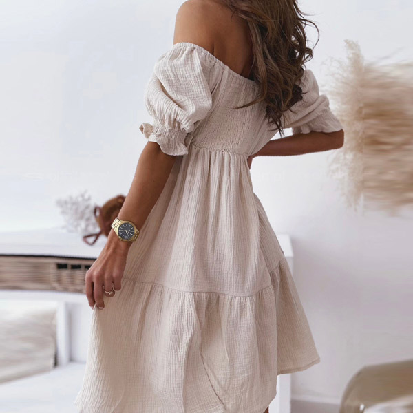 Wanna your dating look full of sweet and flirty sense? Then let this dress help you! It comes with a solid color,finished with short sleeve,high waist and off-shoulder boat neck design,this dress not only can showcase your slender figure,but also can exude your feminine side. At this time,adding a choker necklace can make you look more beautiful!