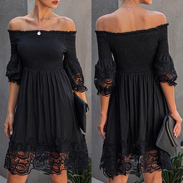 You need a sexy and flirty little black dress to take you to different fancy events? Then how about this piece? The off-shoulder boat neck and lace spliced design can make you look more alluring. When matching with your sexy heels and sparkle necklace,you can look stunning enough!