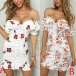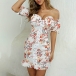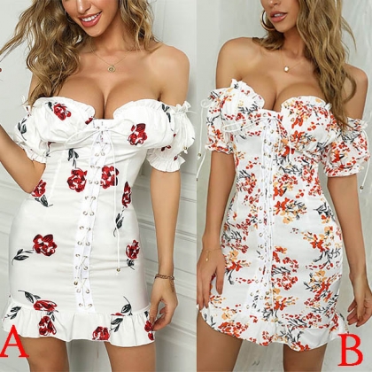 Sexy Off-shoulder Boat Neck Short Sleeve Ruffle Hem Slim Fit Printed Dress