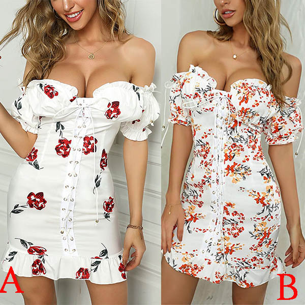 Any girl can look effortlessly charming and beautiful in this printed dress. The off-shoulder boat neck,ruffle hem and lace-up details make this piece look so sexy and alluring,while its fit silhouette design will portray your seductive curve. No matter when and where you are,this dress can easily make you be the focus.