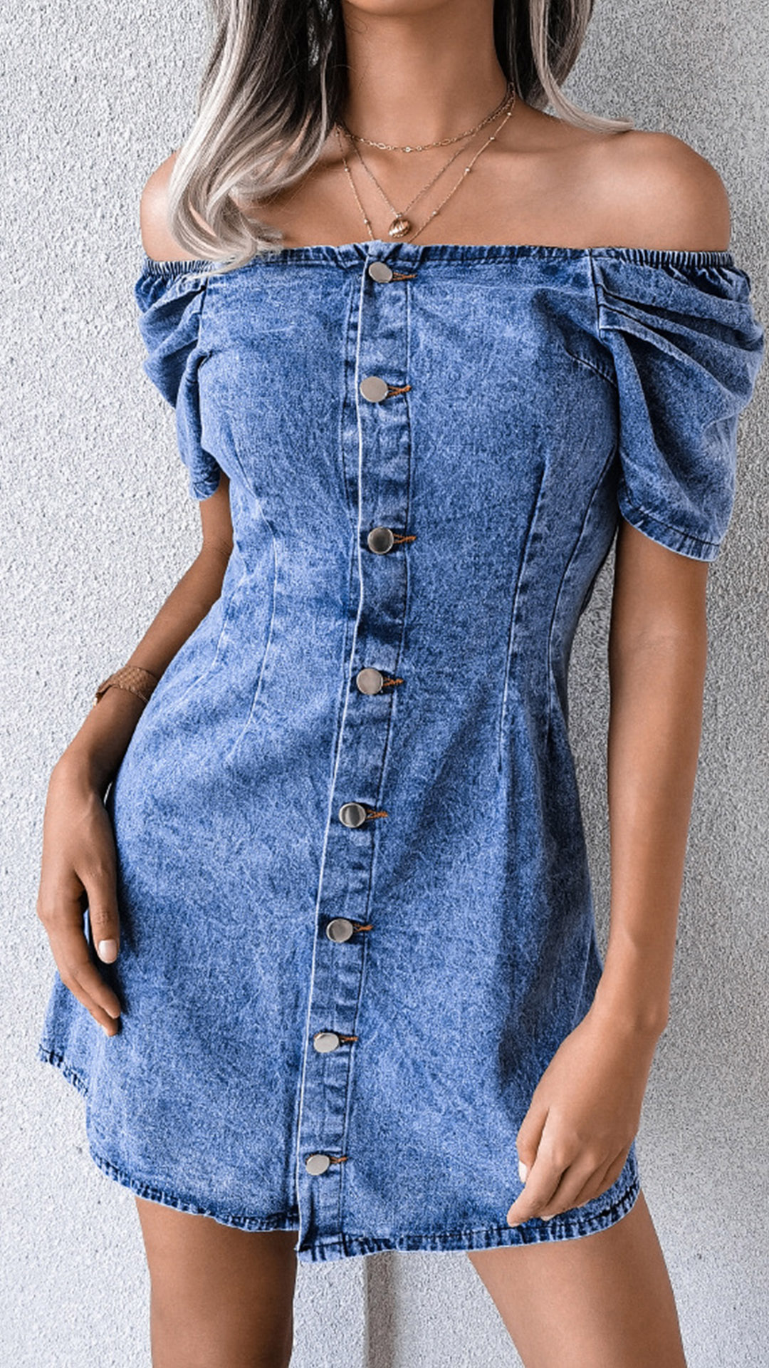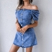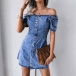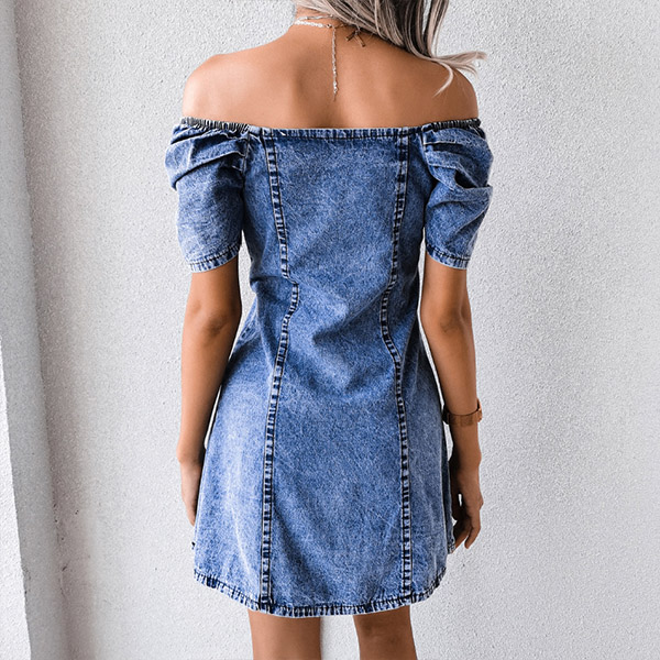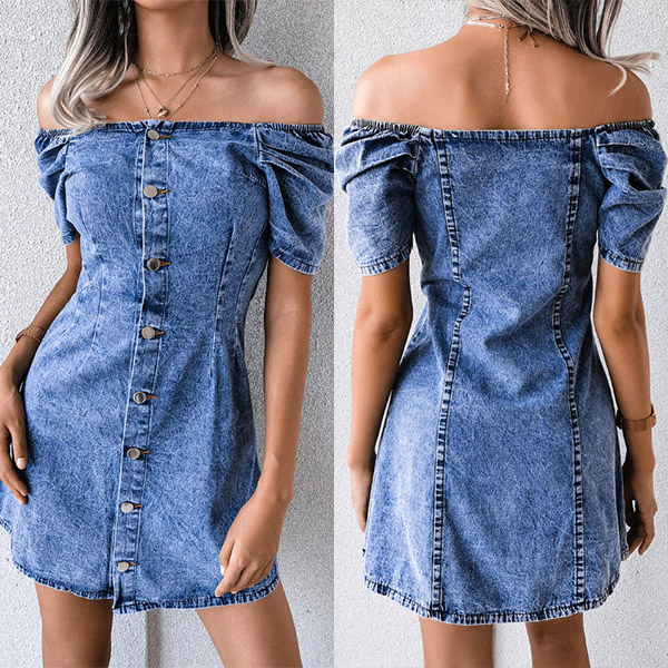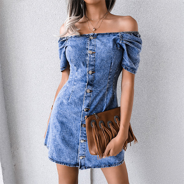 Sexy Off-shoulder Boat Neck Short Sleeve Single-breasted Denim Dress