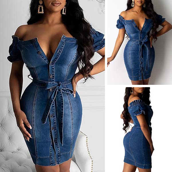 Sexy Off-shoulder Boat Neck Short Sleeve Slim Fit Denim Dress
