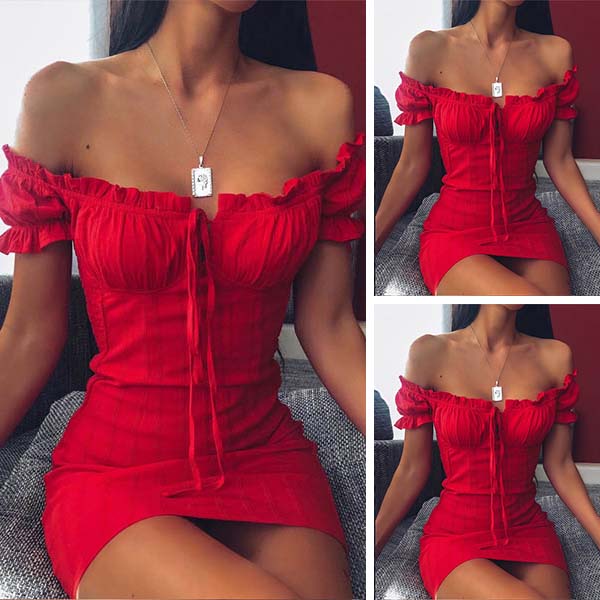 This dress comes with an eye-catching and delightful red tone,which can easily draw more attention. In addition,the off-shoulder boat neck and fit silhouette design can portray your slender figure and charming feminine appeal. Dress it up with your sexy heels and sparkle necklace,you can look beautiful and stunning enough!