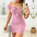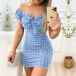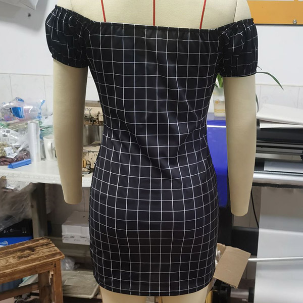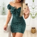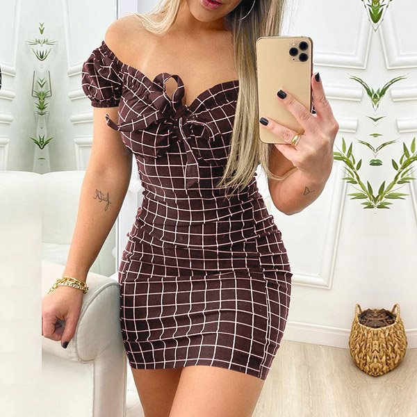 Sexy Off-shoulder Boat Neck Short Sleeve Slim Fit Plaid Dress