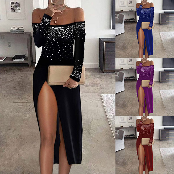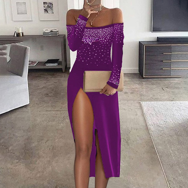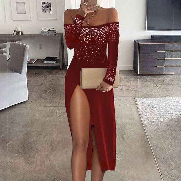 Sexy Off-shoulder Boat Neck Slit Hem Long Sleeve Rhinestone Party Dress