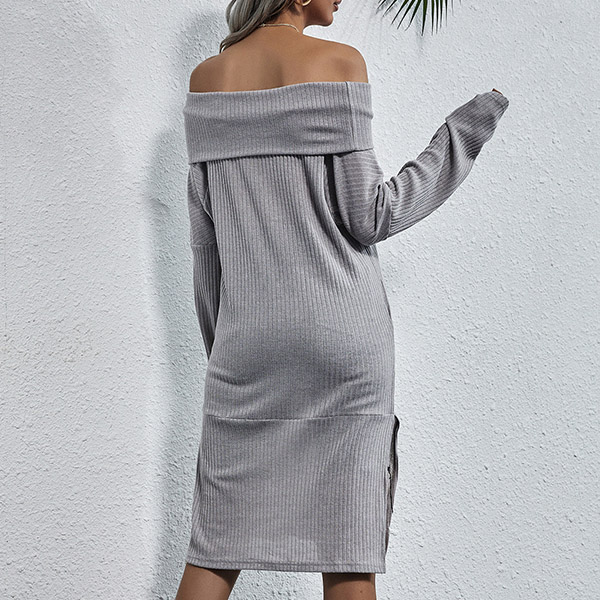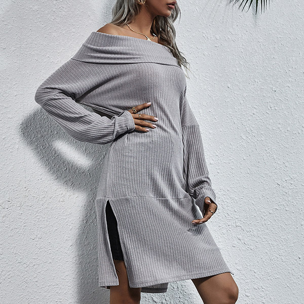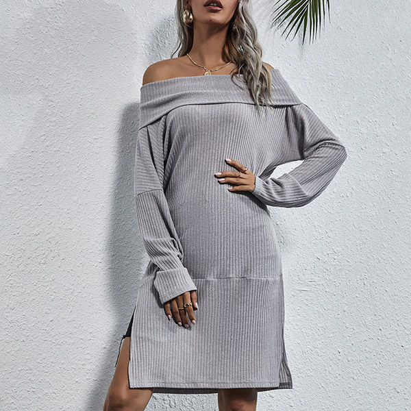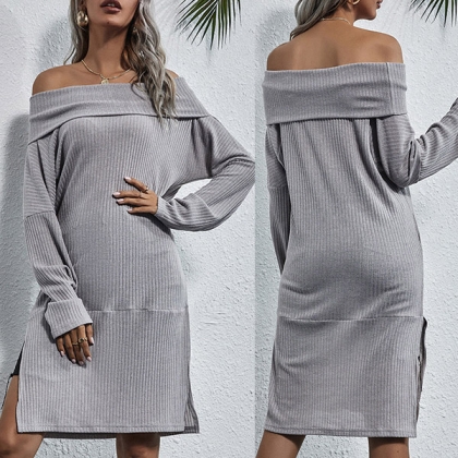 Sexy Off-shoulder Boat Neck Slit Hem Long Sleeve Solid Color Dress
