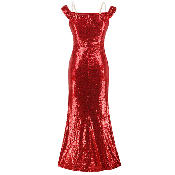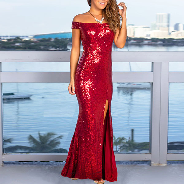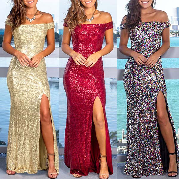 Sexy Off-shoulder Boat Neck Slit Hem Sequin Party Dress