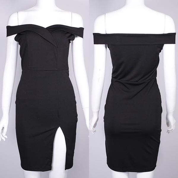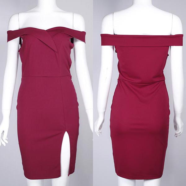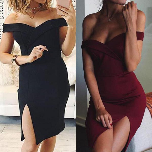 dress on hand. Solid color style,designed with an off-shoulder wide neckline,a fit silhouette and a slit hem,this dress can