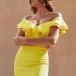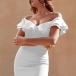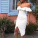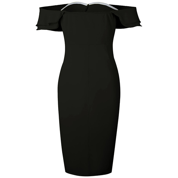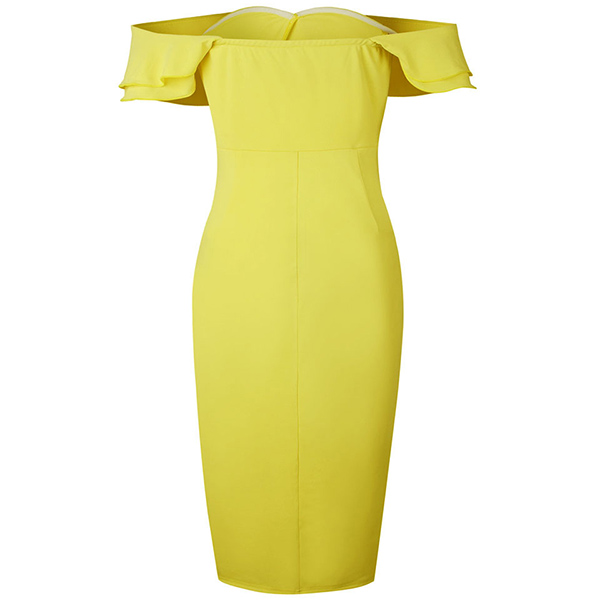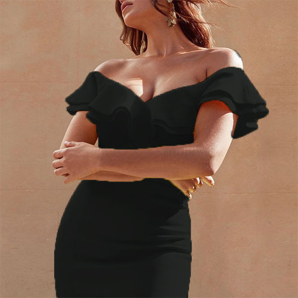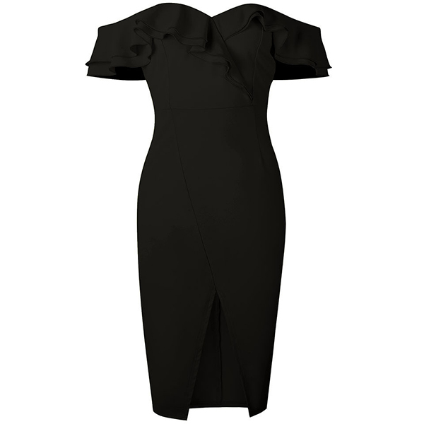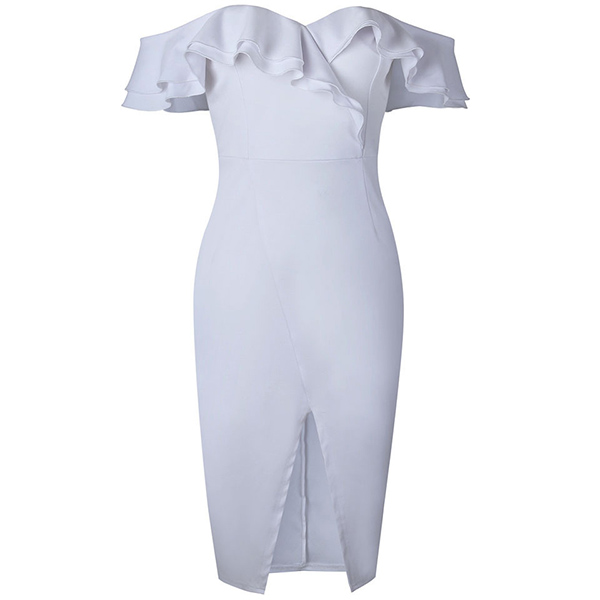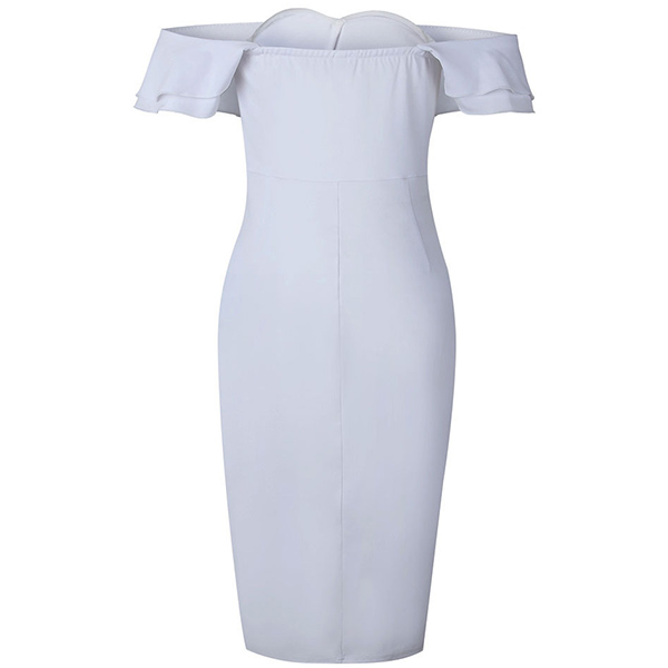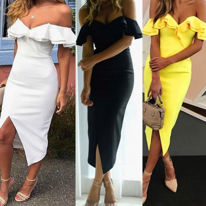 Sexy Off-shoulder Boat Neck Slit Hem Solid Color Slim Fit Ruffle Dress