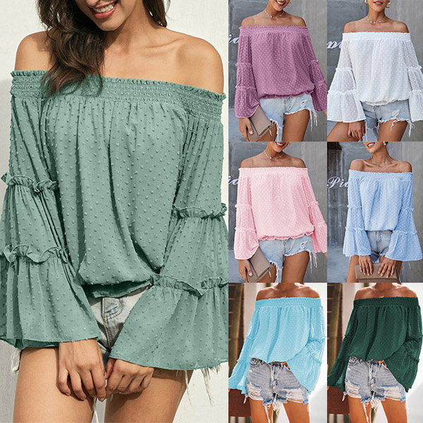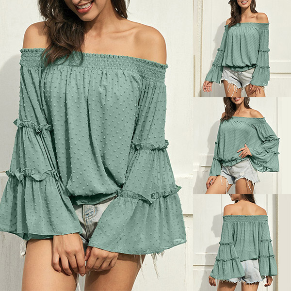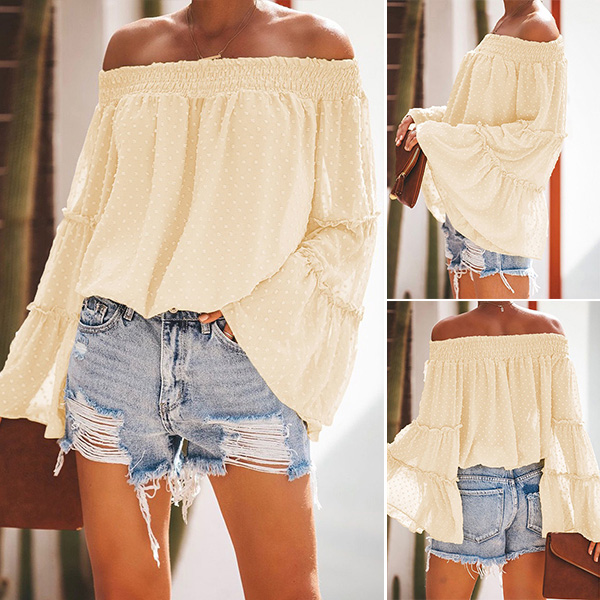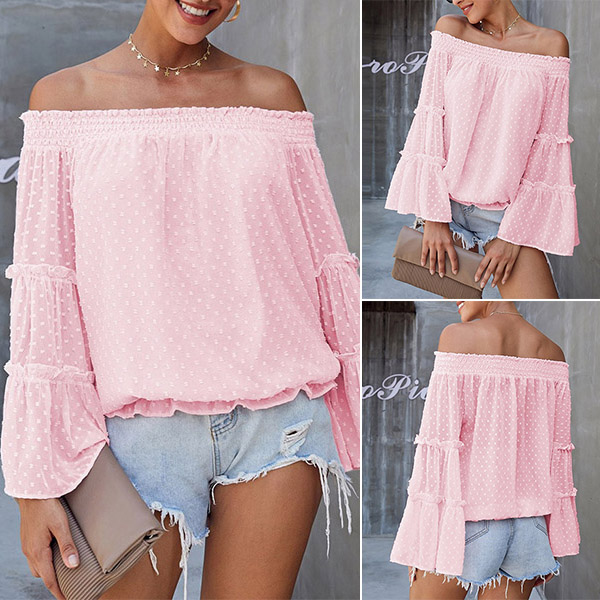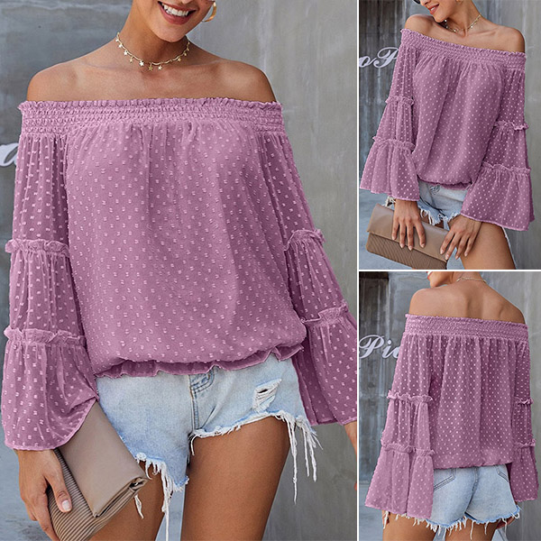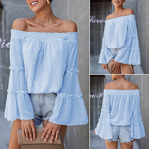Only need one glance,you would be attracted by this chic and stylish chiffon top. The off-shoulder boat neck and trumpet sleeve design are the highlights,which can lend you a dash of sexy and flirty vibes. If you wanna look more stunning and charming,then you can consider adding a choker necklace.
