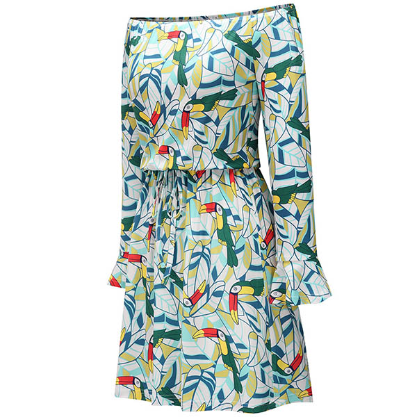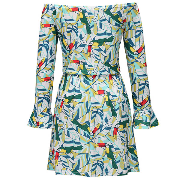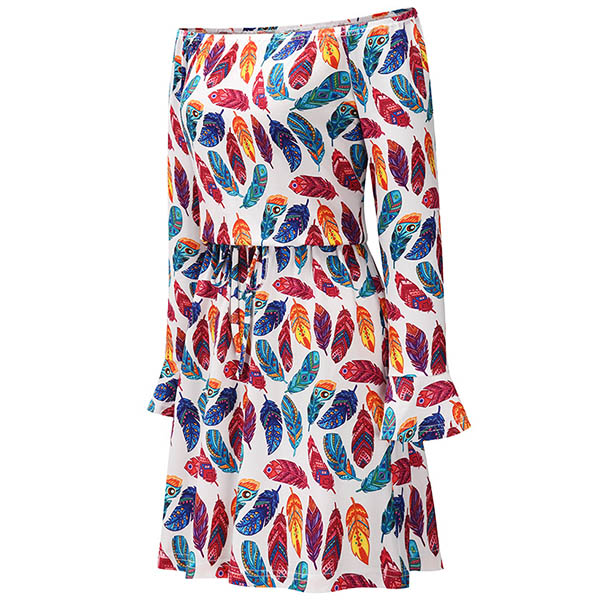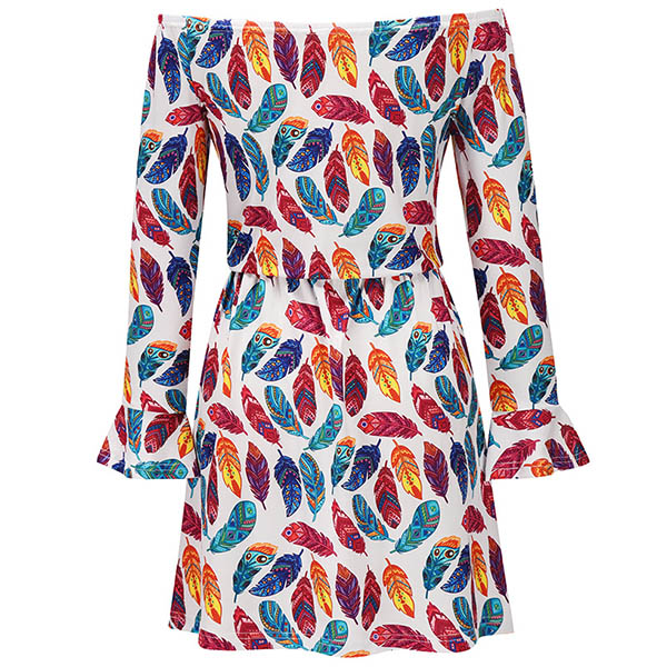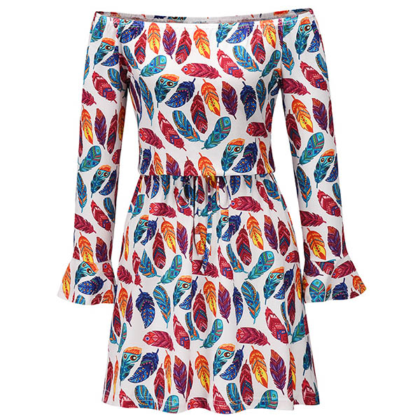 Sexy Off-shoulder Boat Neck Trumpet Sleeve Printed Dress