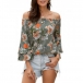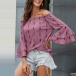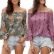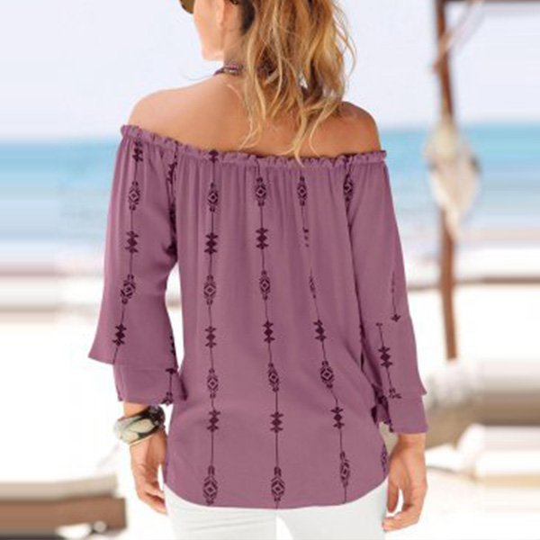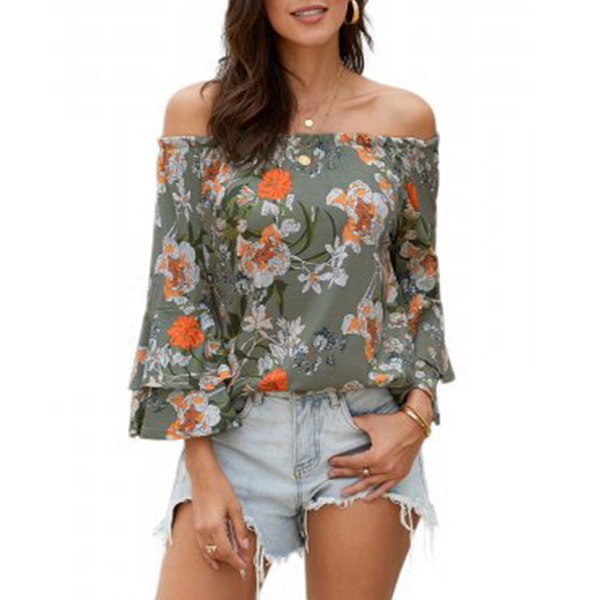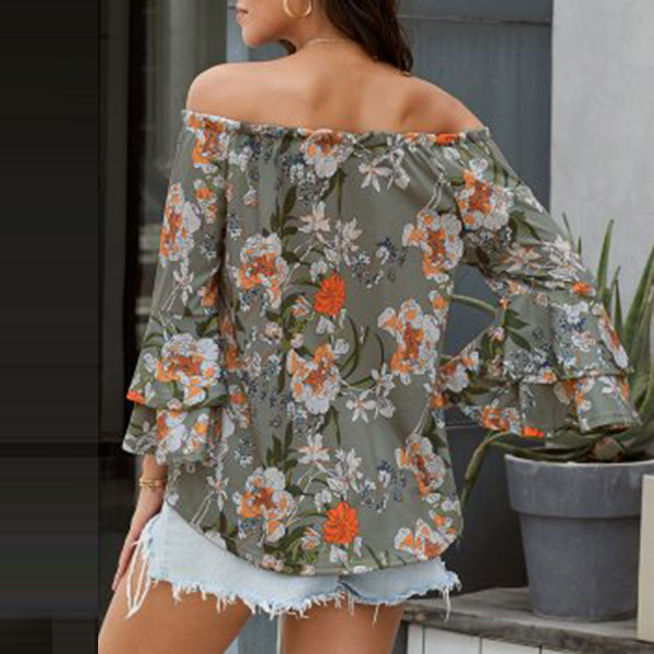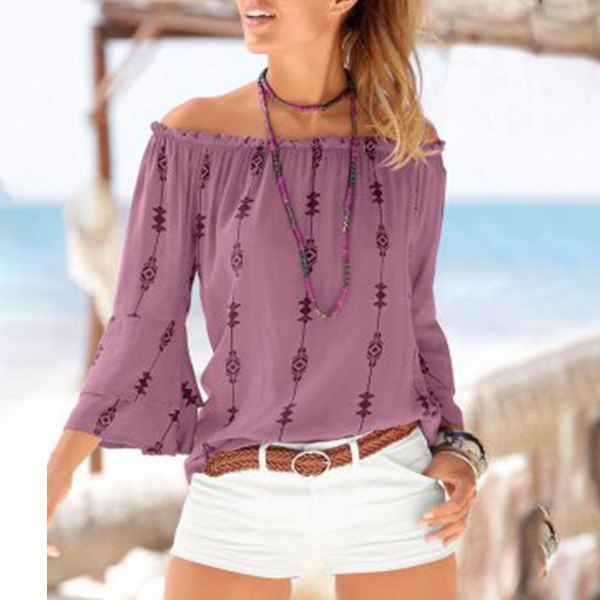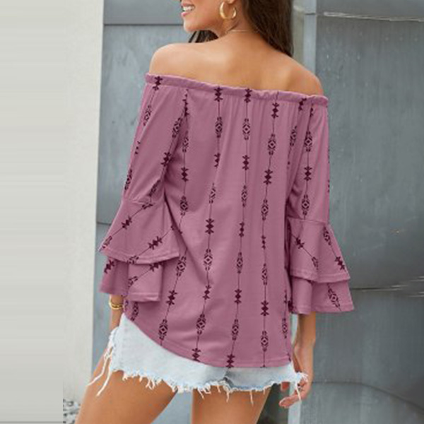 Sexy Off-shoulder Boat Neck Trumpet Sleeve Printed Top