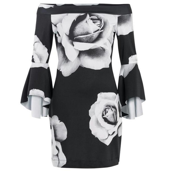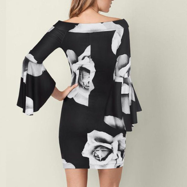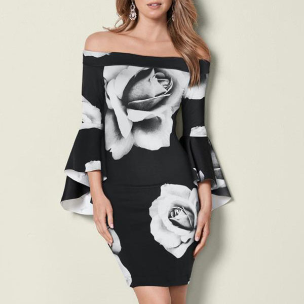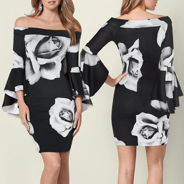 When you have no idea about what to wear for your night dating and weekend gatherings,then you can make your eyes focused on this dress. Its stunning design details like off-shoulder boat neck,trumpet sleeve and chic printed details make this piece look so eye-catching and flirty,while the fit silhouette design can portray your slender figure. It can be a secret weapon to express your beauty and charm.
