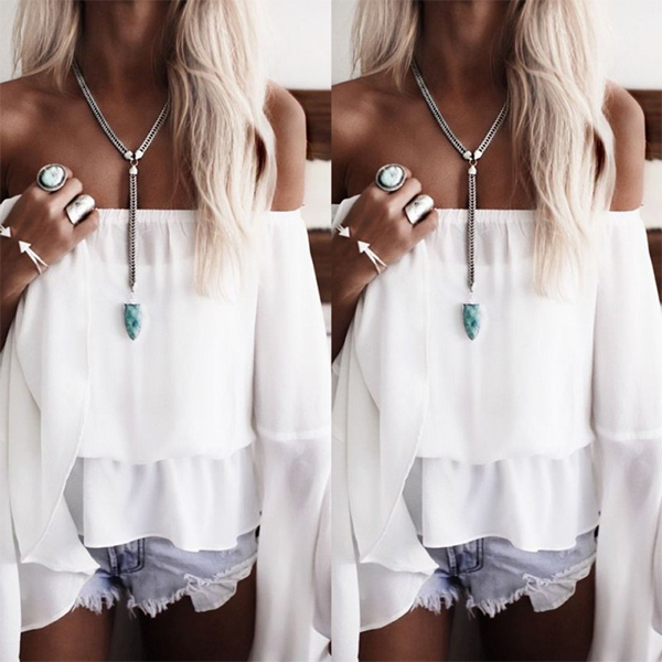 off-shoulder wide neckline and trumpet sleeve design,this item is a good way to exude your female charm and feminine side.