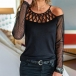 Compared with your other t-shirts,this piece can help you win more eyes. Its distinctive design details like off-shoulder,hollow out and gauze spliced long sleeve design make this piece look so sexy and flirty. Wanna update your style? Then let this t-shirt help you!