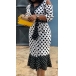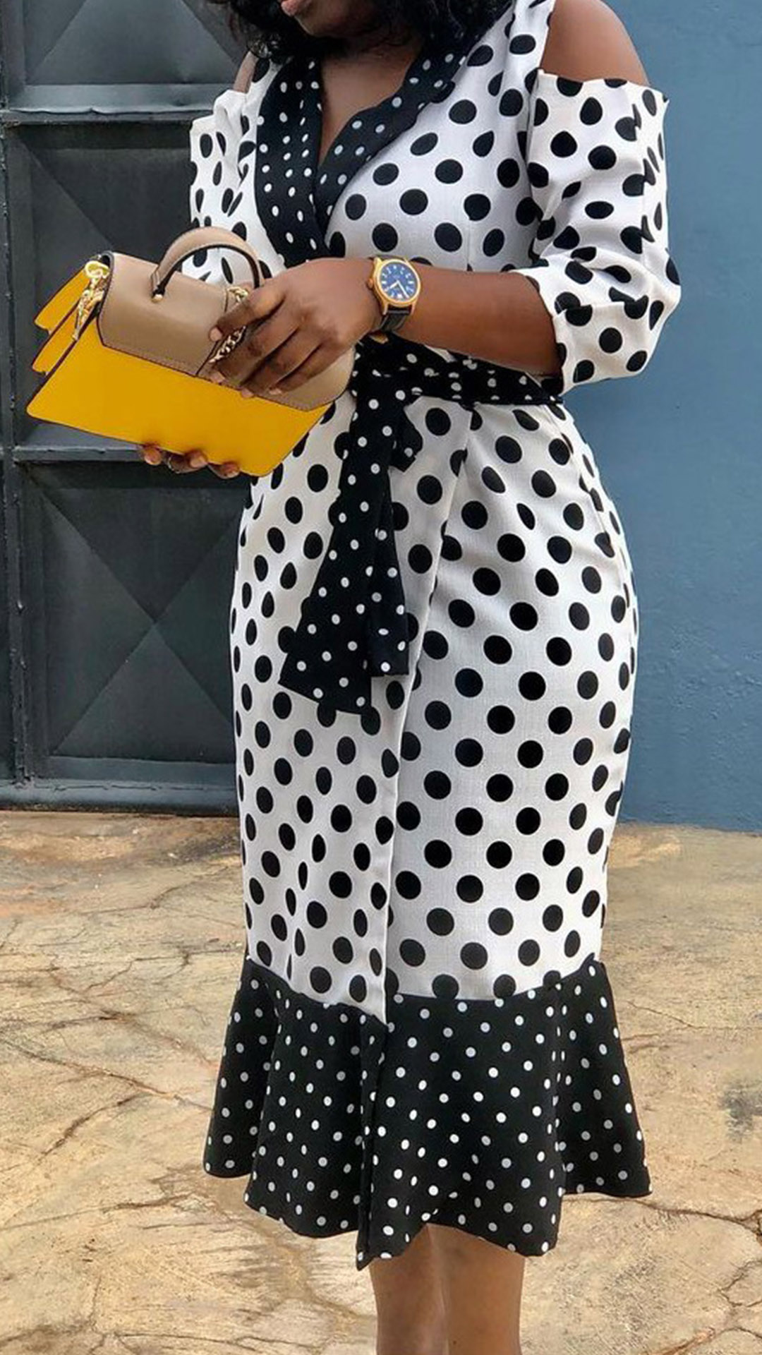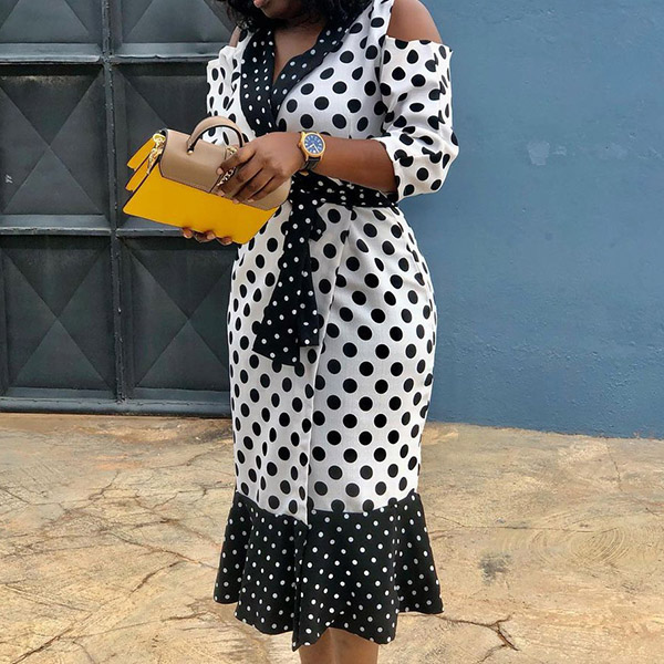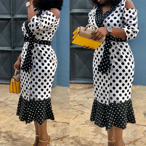 Combines of classic white and black tone,designed with dots printed details,this dress can offer you a more eye-catching look. Moreover,the v-neck,off-shoulder and ruffle hem design will lend you some sweet and flirty vibes. For your some special occasions,this dress would be your perfect choice.