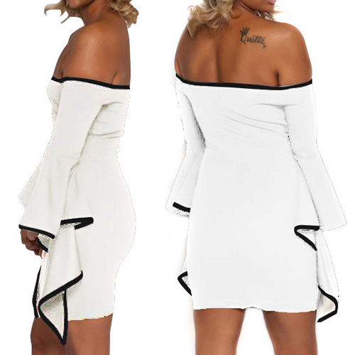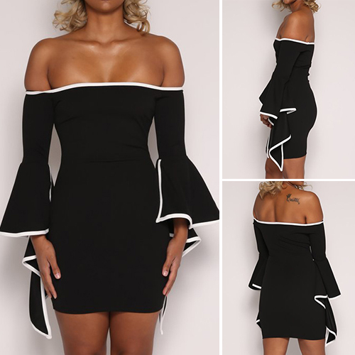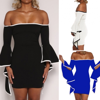 a fit silhouette and irregular trumpet sleeve,all these details make this dress look so distinctive and sultry. This little