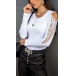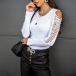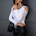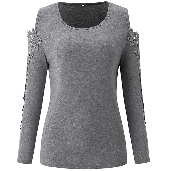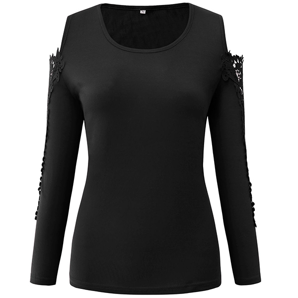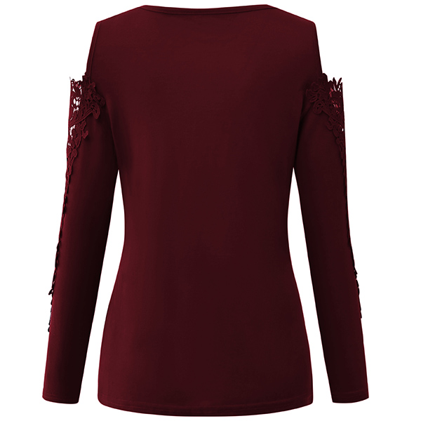 Sexy Off-shoulder Lace Spliced Long Sleeve Round Neck Solid Color T-shirt