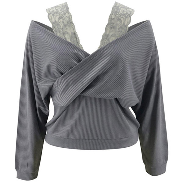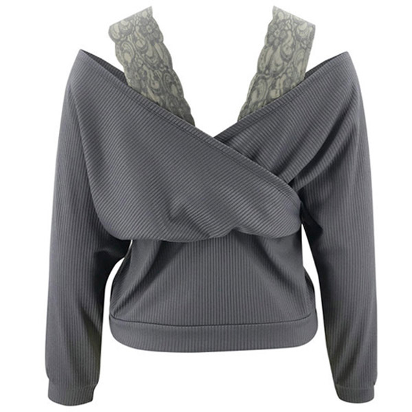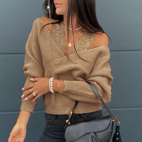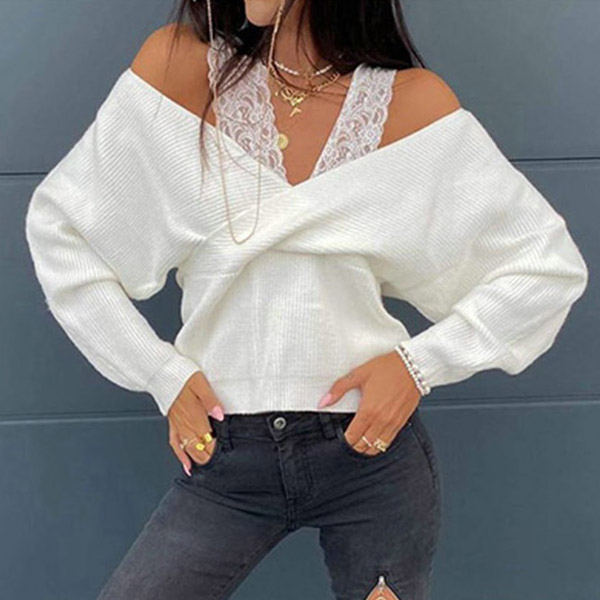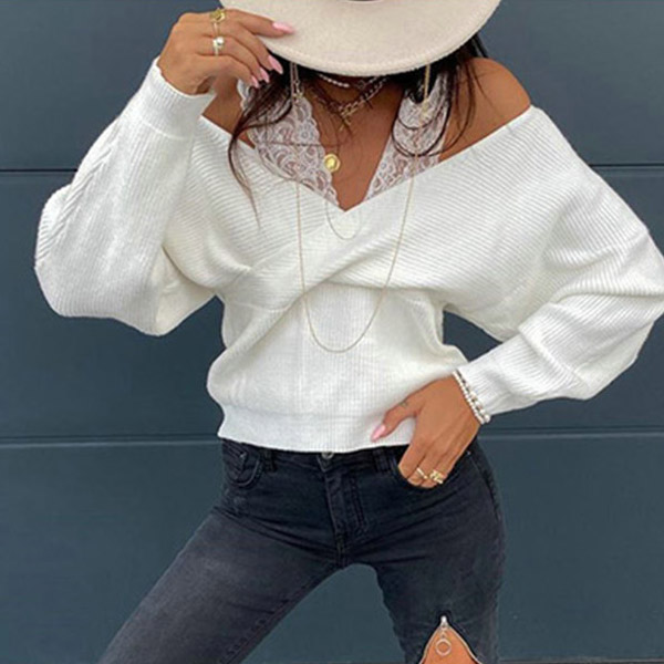 Sexy Off-shoulder Lace Spliced Long Sleeve Solid Color Knitted Top