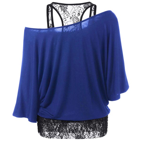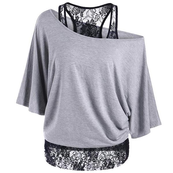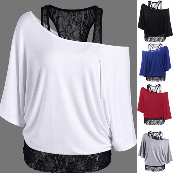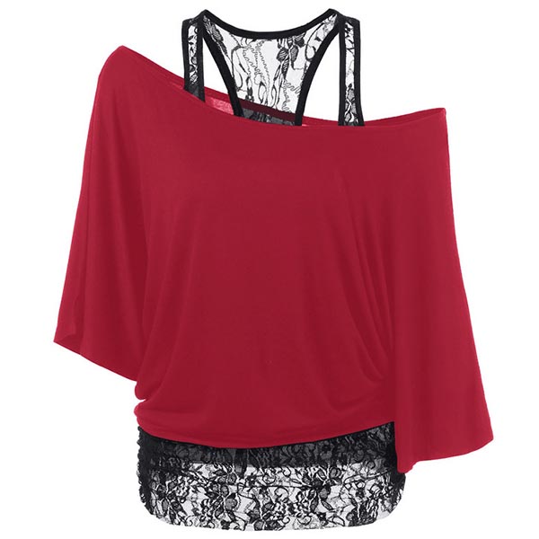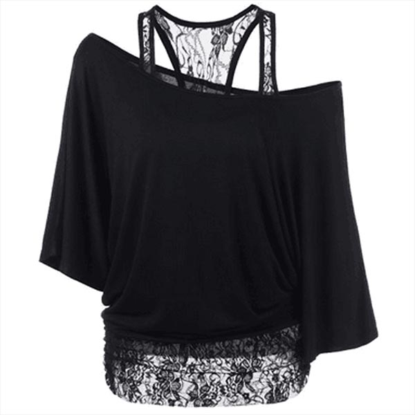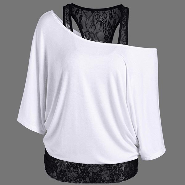 Cozy without losing femininity,that's why we love this t-shirt! Mock two-piece style,its off-shoulder and lace spliced