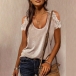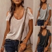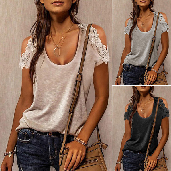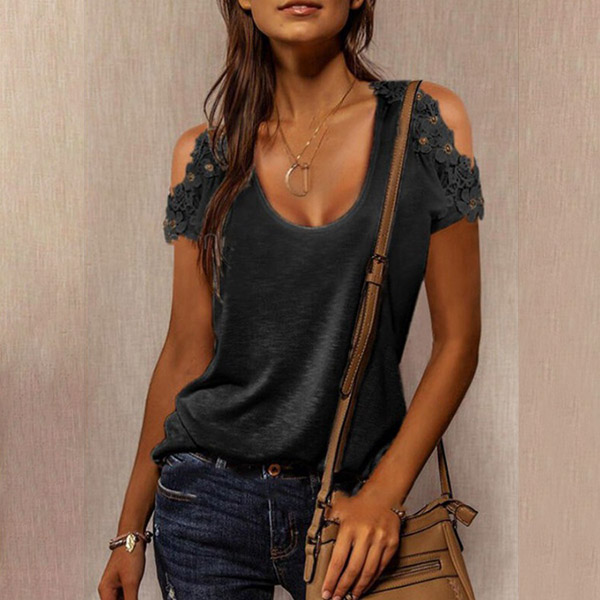 A perfect combination of cozy,stylish and sexy vibes,this t-shirt is worth to have a place in your summer wardrobe ensemble. The off-shoulder and lace spliced details are the highlights,which will make this piece look more attractive. When you wanna update your t-shirt collections,you can just make your eyes focused on this piece.