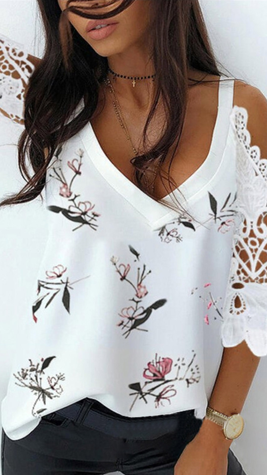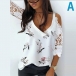 Sexy Off-shoulder Lace Spliced Short Sleeve V-neck Printed Sling Top