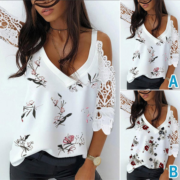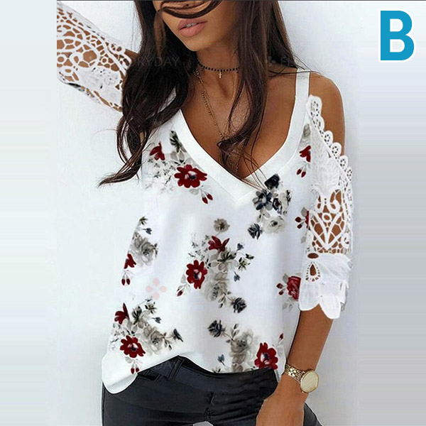 Where cozy and flirty vibes collide - this t-shirt is just the thing you need on the weekends. The design highlights like off-shoulder,lace spliced short sleeve and chic printed details make this piece look so attractive. Another design highlight is that it can be matched with different style bottoms like shorts,skirt,jeans and so on.
