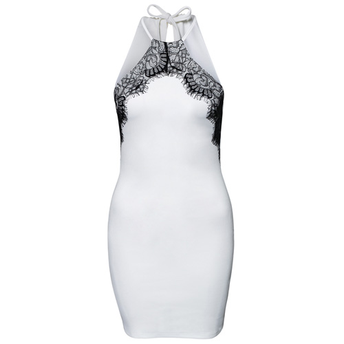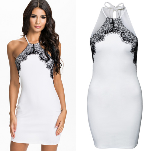 This dress features halter off-shoulder style,sexy and chic. Lace spliced design