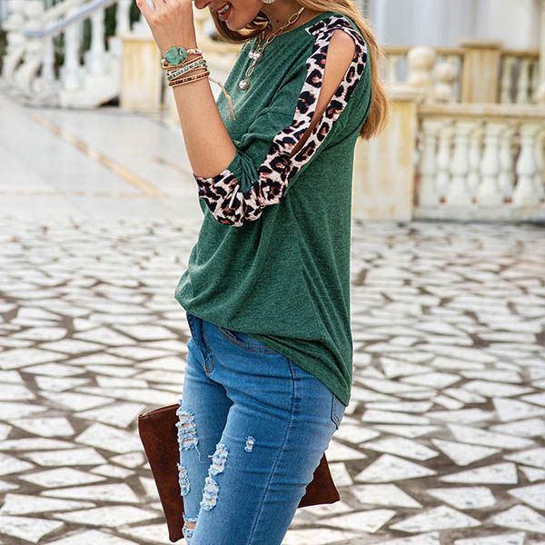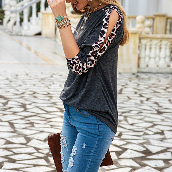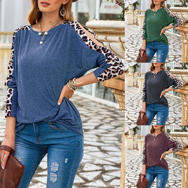 This cozy yet sexy t-shirt can easily arouse your attention. The off-shoulder and leopard printed details at the sleeve part make this piece look more attractive. Meanwhile,its soft and breathable fabric can ensure you a comfortable day. If you like this style,then introduce it to your wardrobe!