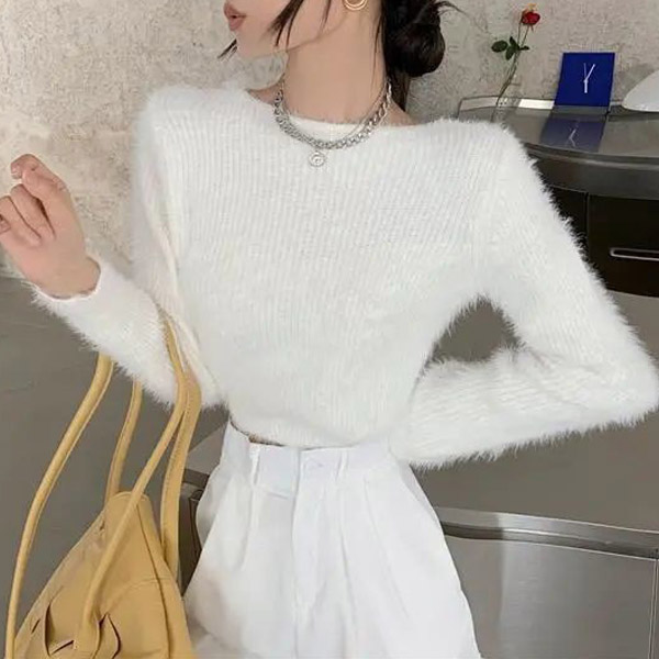 Sexy Off-shoulder Long Sleeve Chain Round Neck Solid Color Sweater