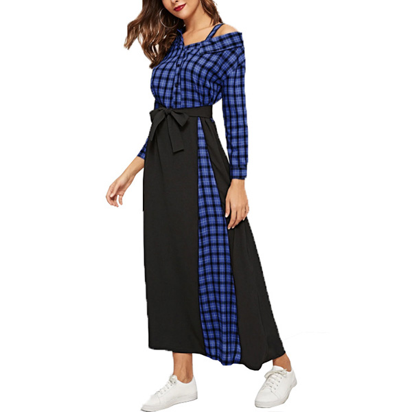 Sexy Off-shoulder Long Sleeve High Waist Plaid Spliced Dress