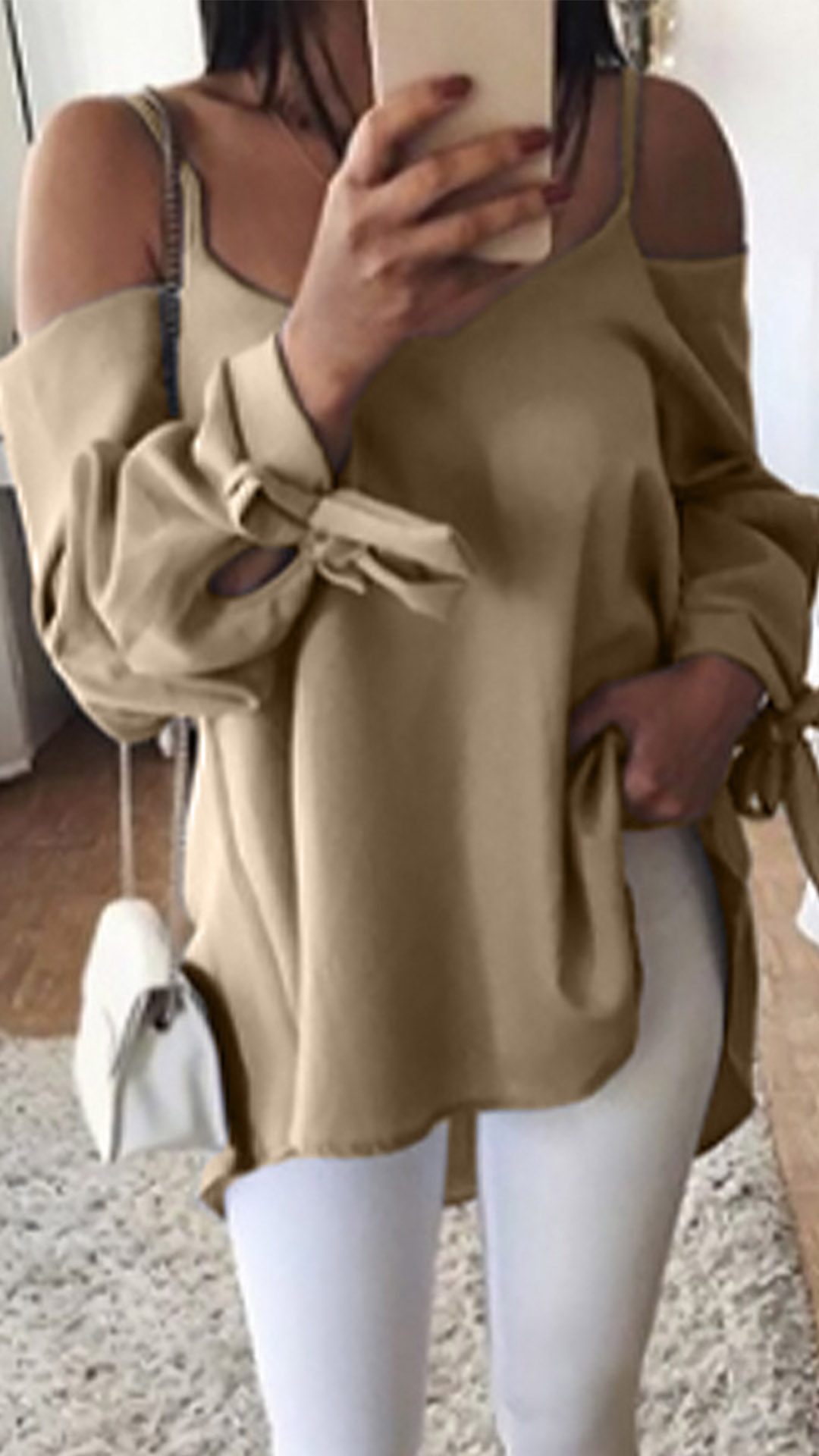 At your first sight,you would be attracted by this chic,sassy yet flirty top. Sling and off-shoulder design can make you look sexier,while the lace-up design at the cuff part will further enhance its charm. Meanwhile,its soft,breathable fabric and loose silhouette can give you an all-day comfort. So why not take interest in it?