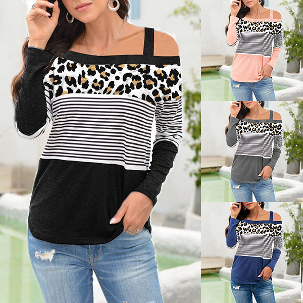 This t-shirt that exudes stylish and sexy vibes is worth to have a place in your wardrobe. The leopard printed details and stripe element design can easily enrich the design style,while the off-shoulder design can lend you a dash of sexy and flirty vibes. Attracted by this piece? Then invite it to your wardrobe!