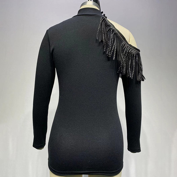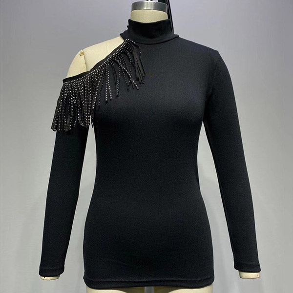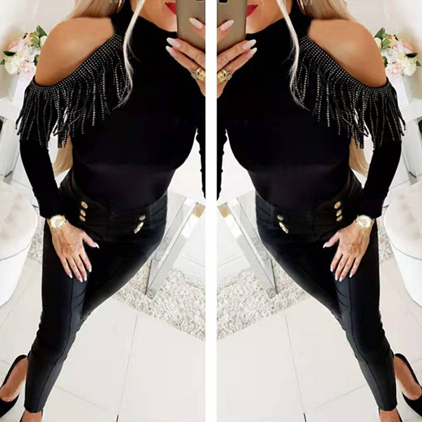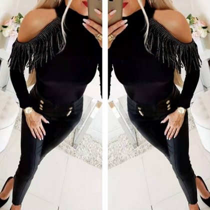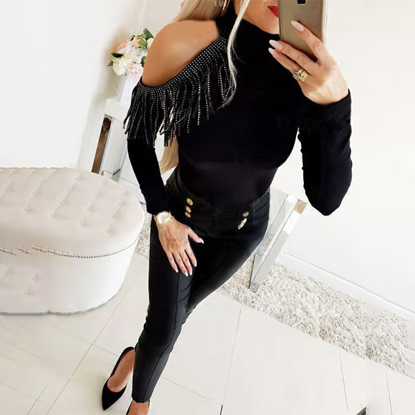 Sexy Off-shoulder Long Sleeve Mock Neck Slim Fit Tassel Top