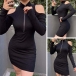 Sexy Off-shoulder Long Sleeve Mock Neck Solid Color Slim Fit Dress (It falls small)
