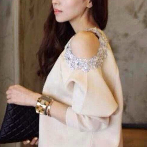 round neck design. The most eye-catching design? Its off-shoulder and hand-beaded design.