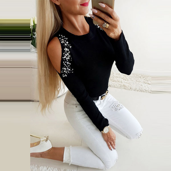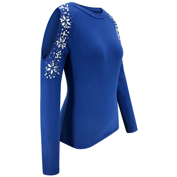Sexy Off-shoulder Long Sleeve Round Neck Rhinestone Spliced T-shirt