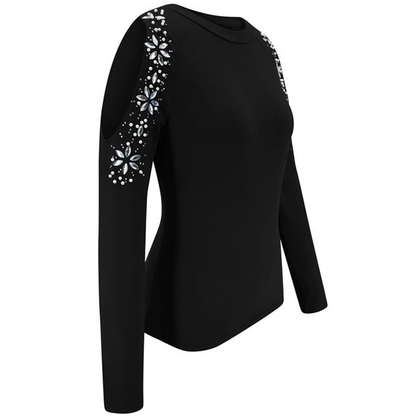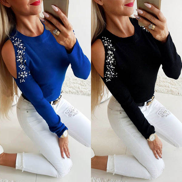 Combines of sexy and stylish vibes,this t-shirt is worth to arouse you attention. The off-shoulder and rhinestone details make this piece look so sexy and shinning. Finished with long sleeve,round neck and a fit silhouette,this wonderful piece can offer you different fashion styles by matching with different style bottoms.