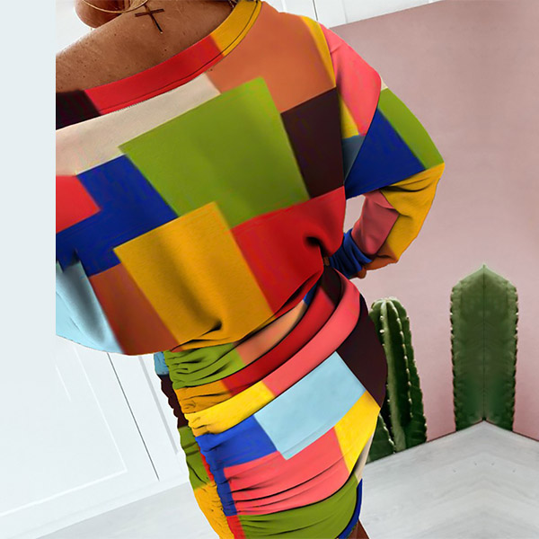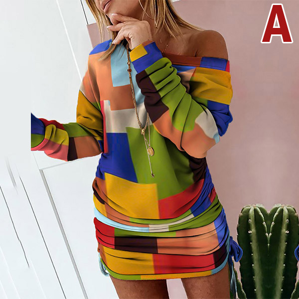 Sexy Off-shoulder Long Sleeve Side-drawstring Contrast Color Dress