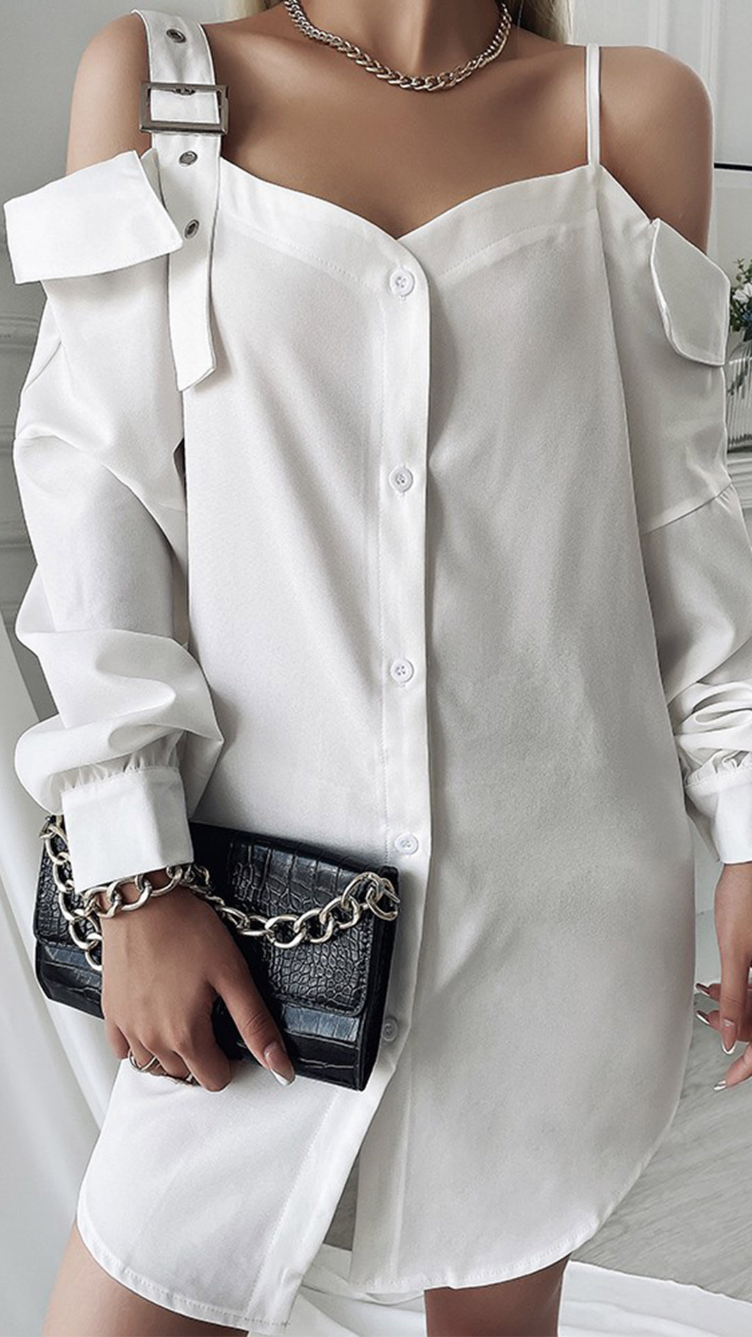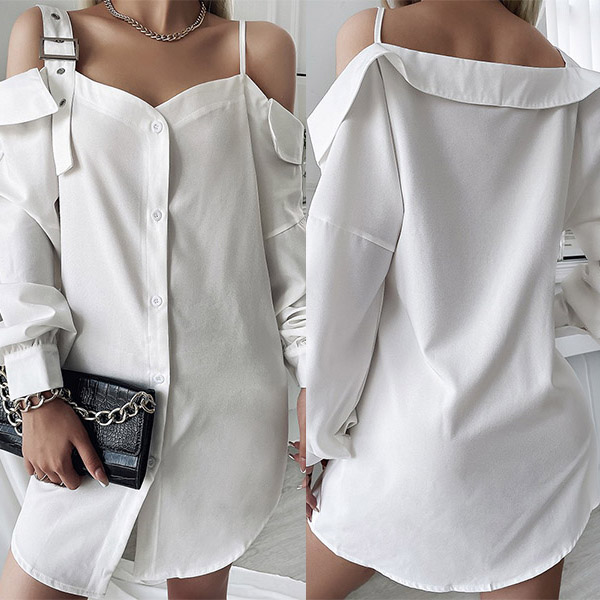 It is a good chance to update your style and boost your charm with the help of this shirt dress. Sling and off-shoulder design can make you look more alluring. Solid color style,finished with long sleeve and single-breasted design,this shirt dress can keep the comfy as well as offer you a sassy and flirty daily look!