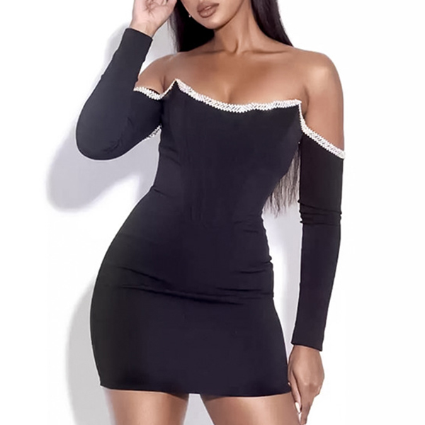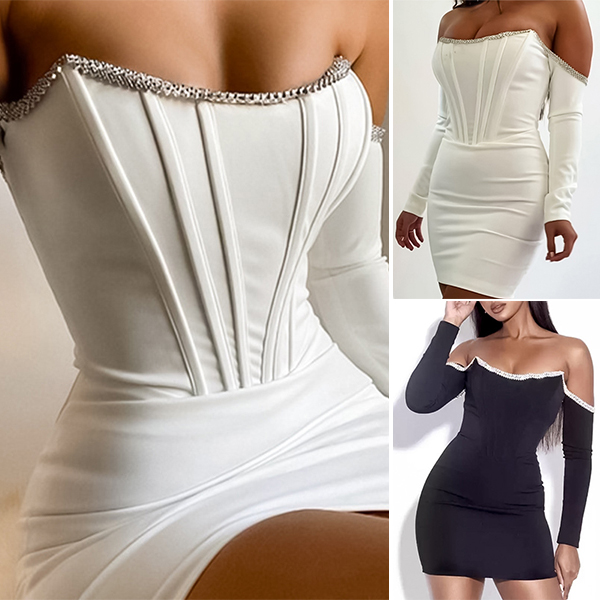 Sexy Off-shoulder Long Sleeve Slim Fit Rhinestone Spliced Party Dress